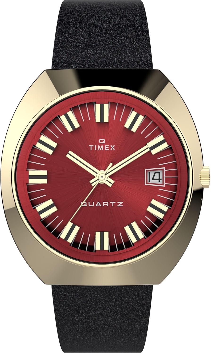 Timex Q Men's 1972 Reissue 43mm Watch – Gold-Tone Case Burgundy Dial with Black Leather Strap