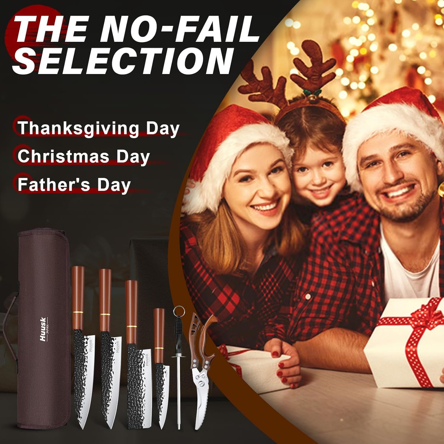 Versatile Knife Set for Everyday Cooking: This Huusk Japanese Knife Set includes a gyuto knife, kiritsuke knife, utility knife, nakiri knife, poultry shears, honing steel, and a portable roll bag, covering most cutting tasks with precision and ease