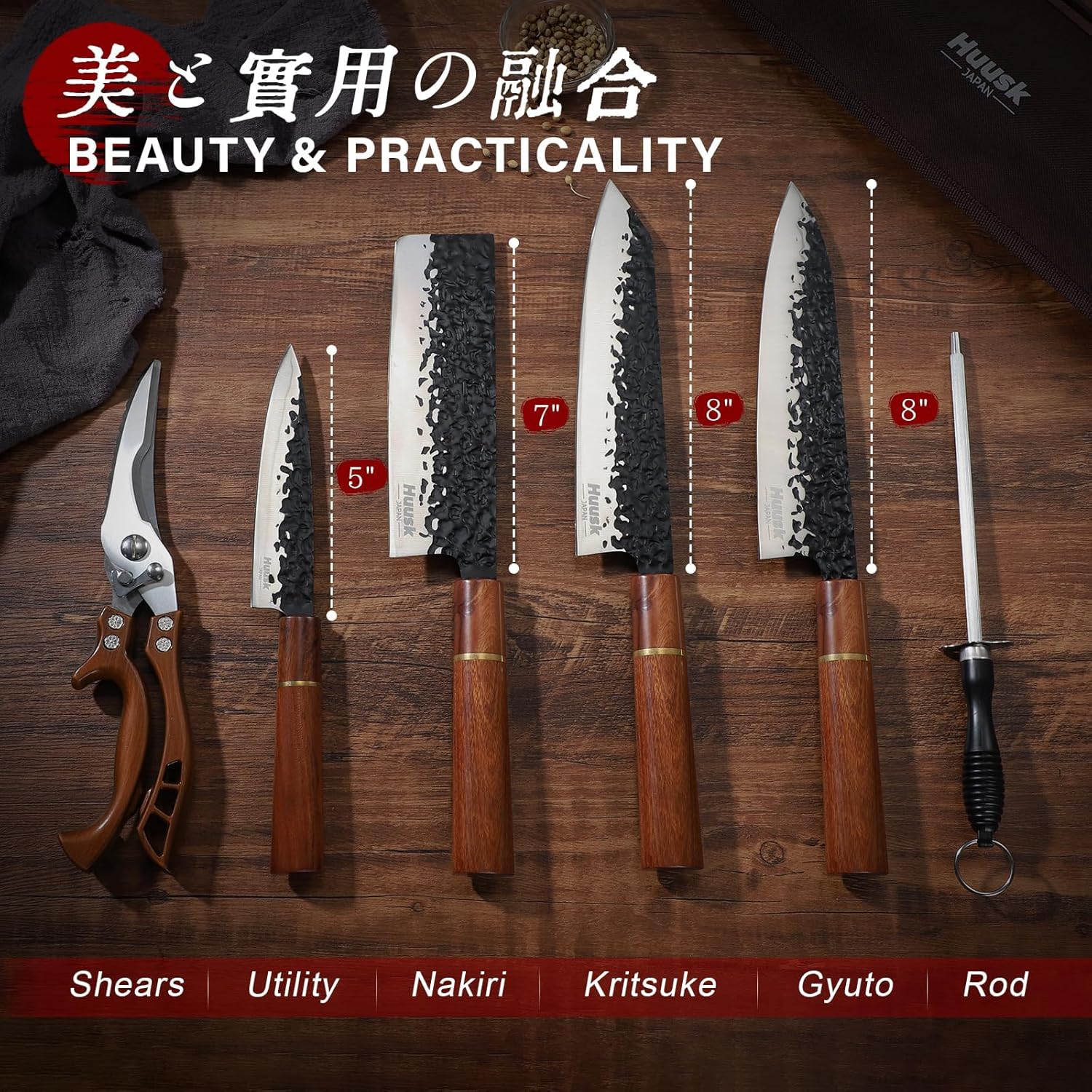Huusk Japanese Knife Set 6pcs with Covers - Professional Chef Knife Set with Bag & Sharpener, High Carbon Steel Forged Knives Sets with Scissors, Japanese Kitchen Knives Sets, Gift for Men Women