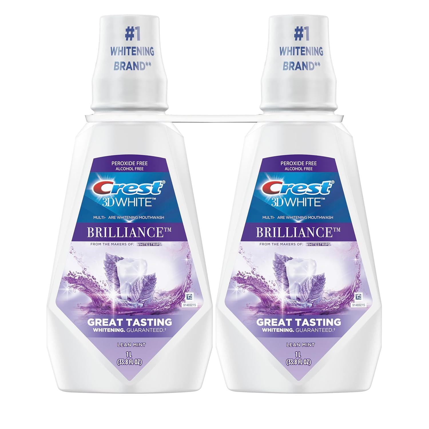 Crest Mouthwash/Mouth Rinse, 3D White Brilliance Whitening, Alcohol Free, Clean Mint, 2x1L (33.8 fl oz)