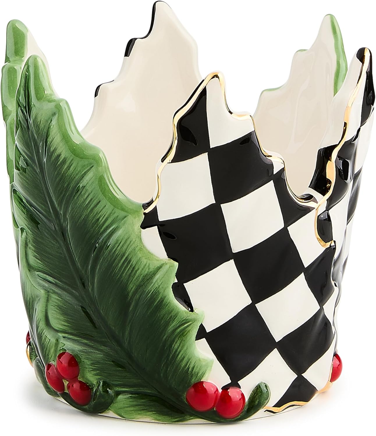 MACKENZIE-CHILDS Ceramic Pillar Candle Holder, Christmas Candle Dish, Short, Holly Leaf