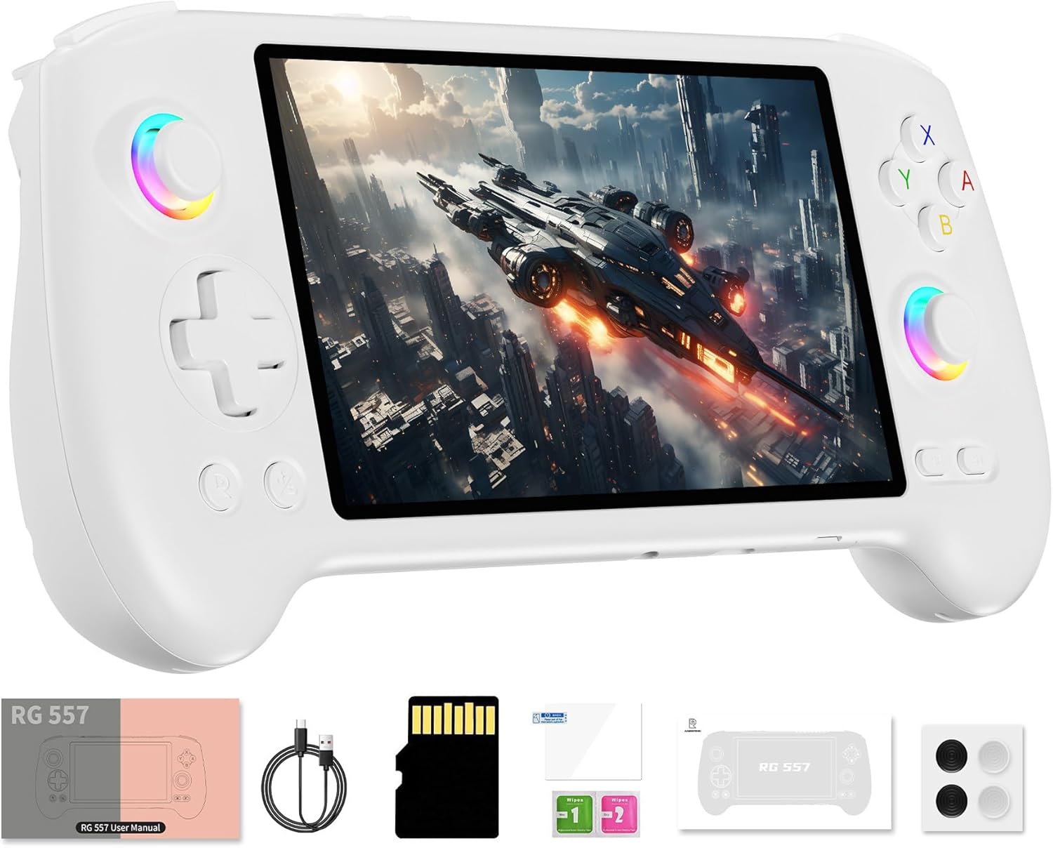 RG557 Retro Handheld Game Console , 5.48 Inch AMOLED Screen Handheld Emulator Android 14 System Dimensity 8300 Processor Support WiFi 6E Bluetooth 5.3(White)