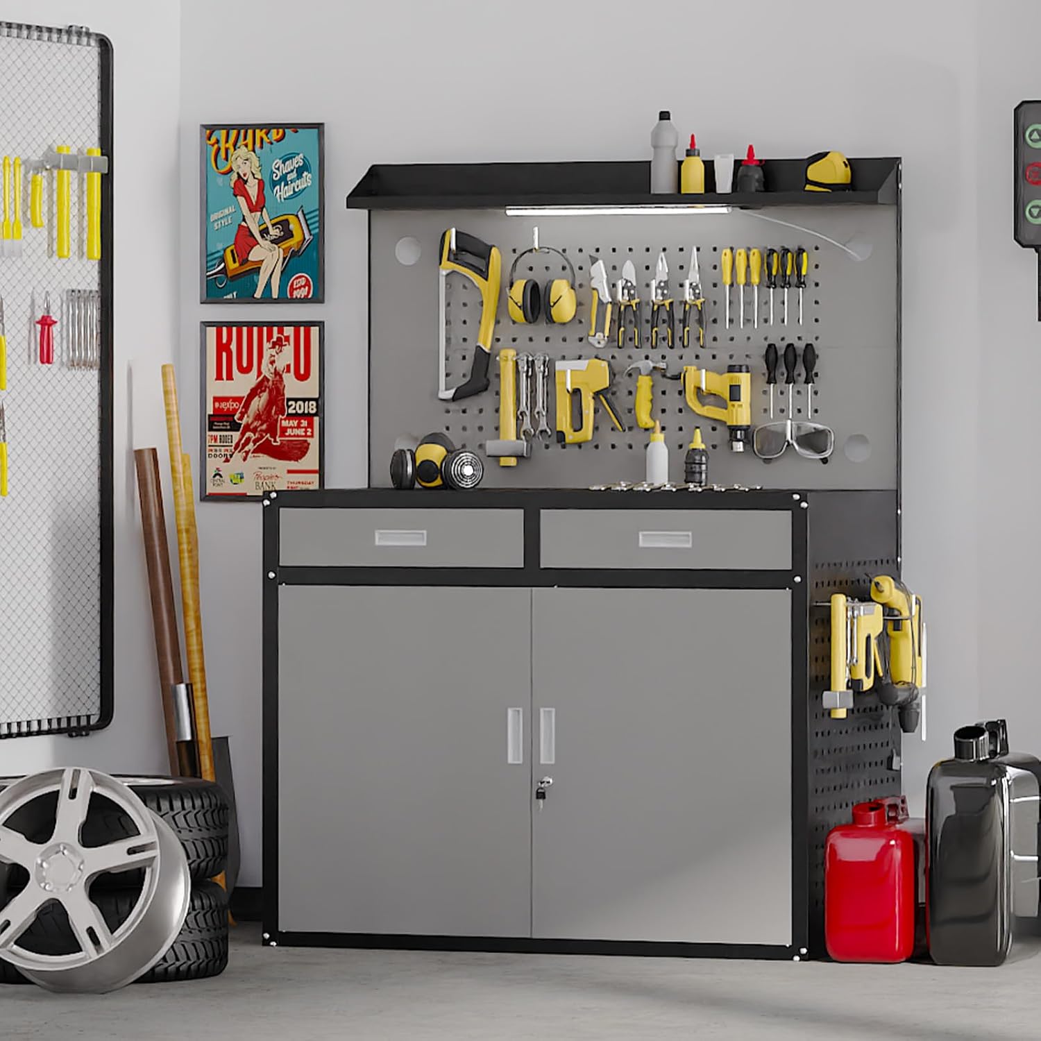 Multi-Functional Storage Solutions:The metal tool bench has a pry-proof locking device enclosed main cabinet to keep valuable tools safe while keeping the work bench nice and neat. Dual drawers are designed to store screws, nuts and utility knives that can easily slip out of place. Three-sided pegboard supports 360° tool hanging system. Top 6"extension table for zero tool drop management and millimetre space utilisation.