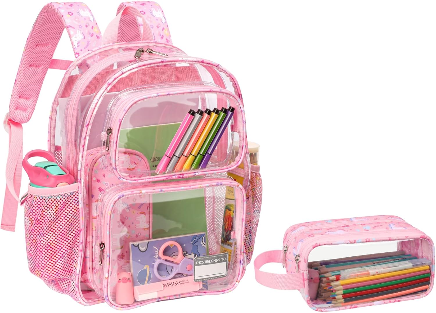 Bagseri 2pcs Clear Backpack for Girls - 15 Inch Backpack and Clear Pencil Case Set, Heavy Duty Transparent Bookbag for School, See Through Bag for Kids Aged 3 to 8, Pink Unicorn