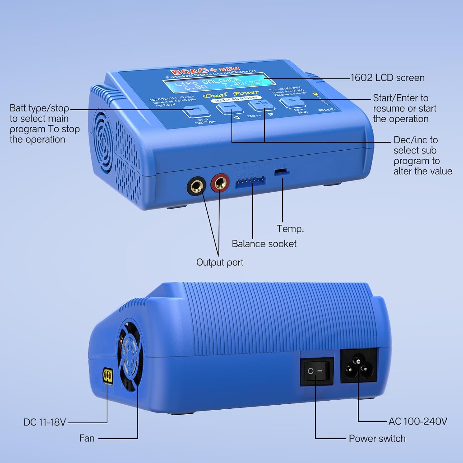 MULTI-MODES: The battery's specification: 80W 6A Input--AC(100-240V), 50/60 HZ, DC(11V-18V), it has charge mode, discharge mode and balance mode, with the charge mode and discharge mode, you can adjust the voltage and current, with the balance mode, it will automatically adjust the voltage and current, you don't need to adjust the voltage or current. When you charge the battery, please don't use the AC power cable and DC cord at the same time.
