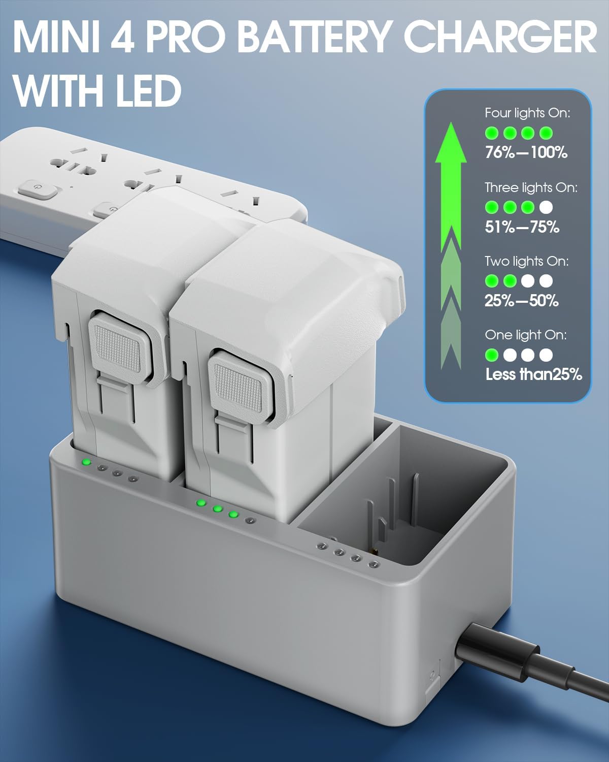 Package for DJI Mini 3 Battery Charger: We provide 1-Year customer support, and problem just turn to us. You will get 2*Mini 3 battery/Mini 4 Pro battery for DJI, 1*Mini 3 Pro/Mini 4 Pro battery charger, and 1*TYPE-C cable