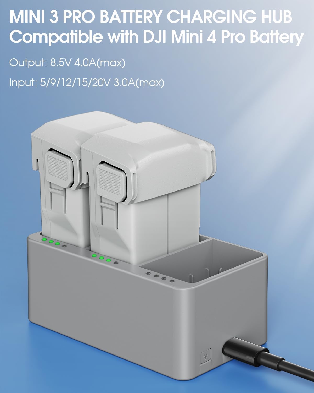 Specially Designed for DJI Mini 3/Mini 4 Pro: Mini 4 Pro battery is compatible with DJI Mini 3, DJI Mini 3 Pro and DJI Mini 4 Pro drone, Mini 3 battery charging hub is fit for DJI Mini 3 battery, DJI Mini 3 Pro battery plus, and DJI Mini 4 Pro battery