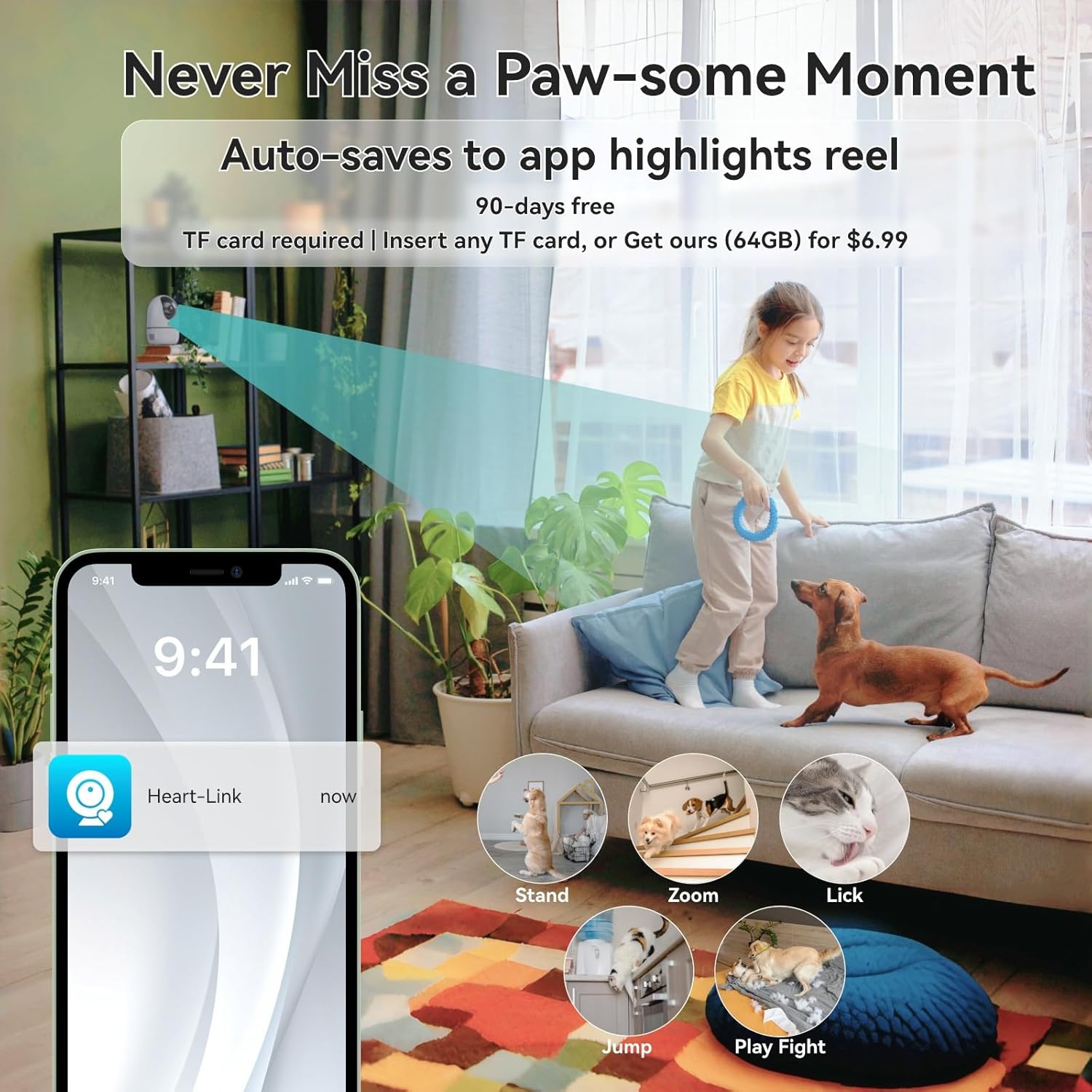 【AI Detection & Location Patrol】This indoor camera designed to detect selected pet actions—such as running, jumping, or standing upright—the camera sends notifications when notable movement occurs. Automatically saves key pet moments to cloud or local storage (TF card required). Location Patrol mode lets you automatically scan multiple areas of your home, so you can keep an eye on your pets no matter where they roam.