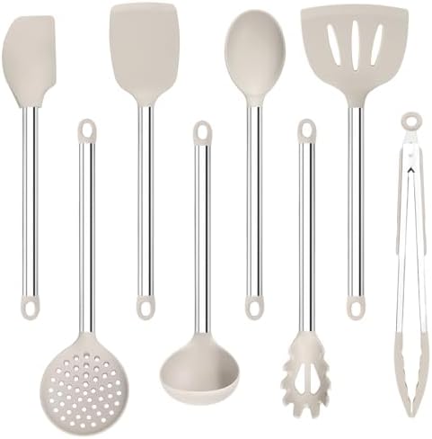 8 Pieces Kitchen Utensils Set, Vayvnt Silicone Cooking Utensils Set for Non-Stick Cookware, Stainless Steel Handle, Heat Resistant Kitchen Gadgets Includes Large Spatula Tongs, Dishwasher Safe, Khaki