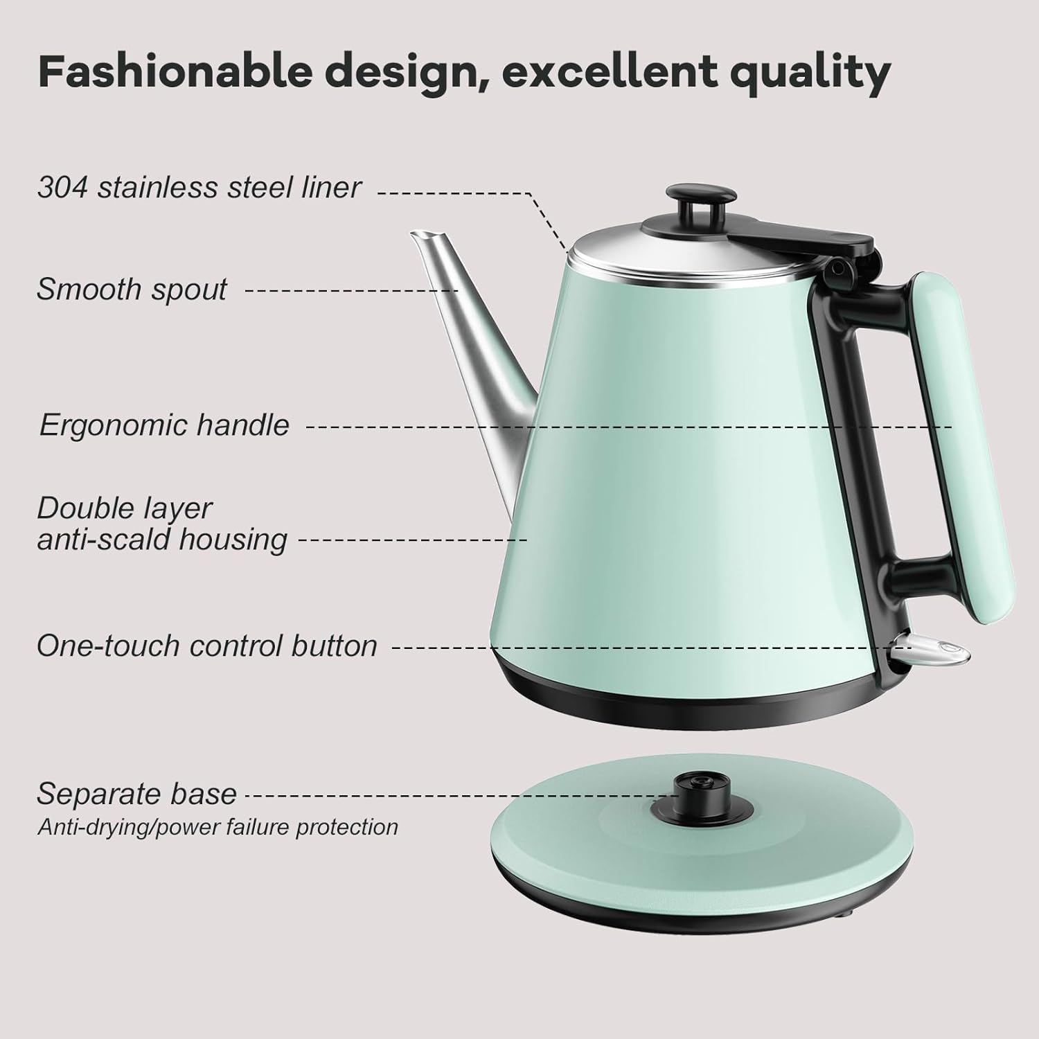 【0.9L Compact Size, Space-Saving】- Designed for small kitchens, dorms, or offices, this 0.9L electric kettle saves counter space while delivering enough hot water for 2-3 cups. Features a food-grade 304 stainless steel interior for hygiene and safety, paired with a heat-resistant plastic exterior for durability. Its mint green retro design adds a modern touch, perfect for coffee lovers or small households.