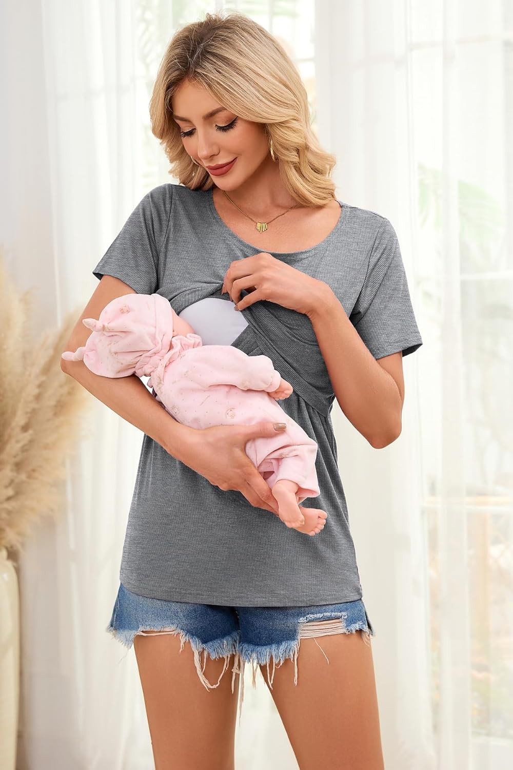 Smallshow Women's Nursing Tops Ribbed Short Sleeve Breastfeeding Shirts 4 Pack