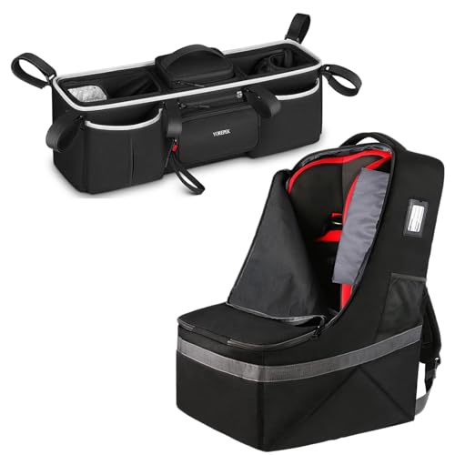 YOREPEK Padded Car Seat Travel Bag Backpack for Airplane and Heavy Duty Double Stroller Organizer Stroller Caddy with Detachable Cooler Bag and Handbag,Stroller Storage Attachment for Baby Accessories