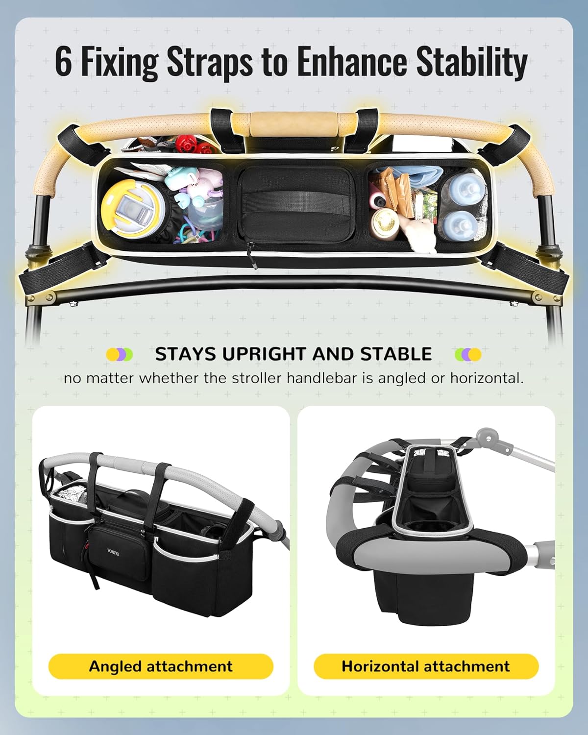 6 Fixing Straps Stability: YOREPEK double stroller organizer bag features 6 adjustable hook-and-loop straps that flexibly fasten to stroller handlebars at various angles—whether horizontal or inclined; This thoughtful design ensures the double jogging stroller organizer stays level and stable during use, preventing tilting and keeping your baby's items securely in place