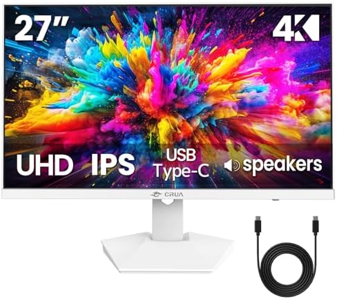CRUA 27" 4K White Monitor, UHD(3840x2160P) IPS Panel, 60Hz Computer Monitor, Supports AMD Freesync, USB Type-C, 120% sRGB, Built-in Speakers, Wall Mountable, for Work, Streaming, and Home Office