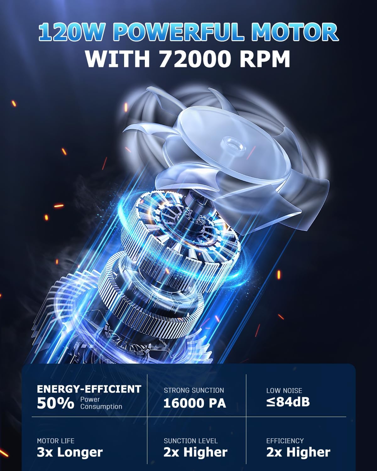 🌀【16KPA POWERFUL SUCTION】The dust busters cordless rechargeable is equipped with a 120W high-powered motor that spins at up to 72,000RPM and provides 16,000PA powerful suction. Whether it's dust and debris on the floor or hidden dirt in narrow crevices can be quickly cleaned. Easily cope with the cleaning of home, car interior, office desktop, efficiently clean every corner, saving you precious time and energy