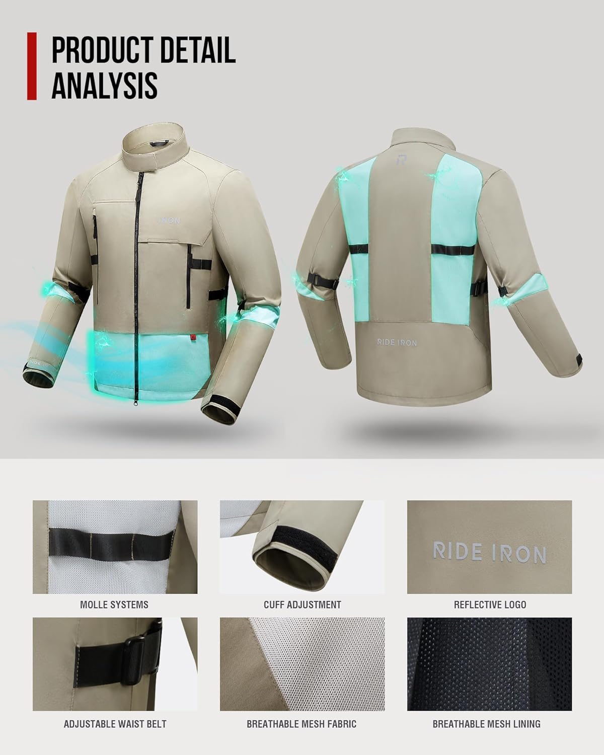 Detail-Oriented Design - Adjustable straps at the waist and elbows, plus hook-and-loop closures at the collar and cuffs, provide a secure, tailored fit that moves with you. MOLLE webbing offers versatile customization for personal accessories, while modern color blocking adds a stylish edge. Light color design enhances the fresh look and keeps you cool on hot summer rides