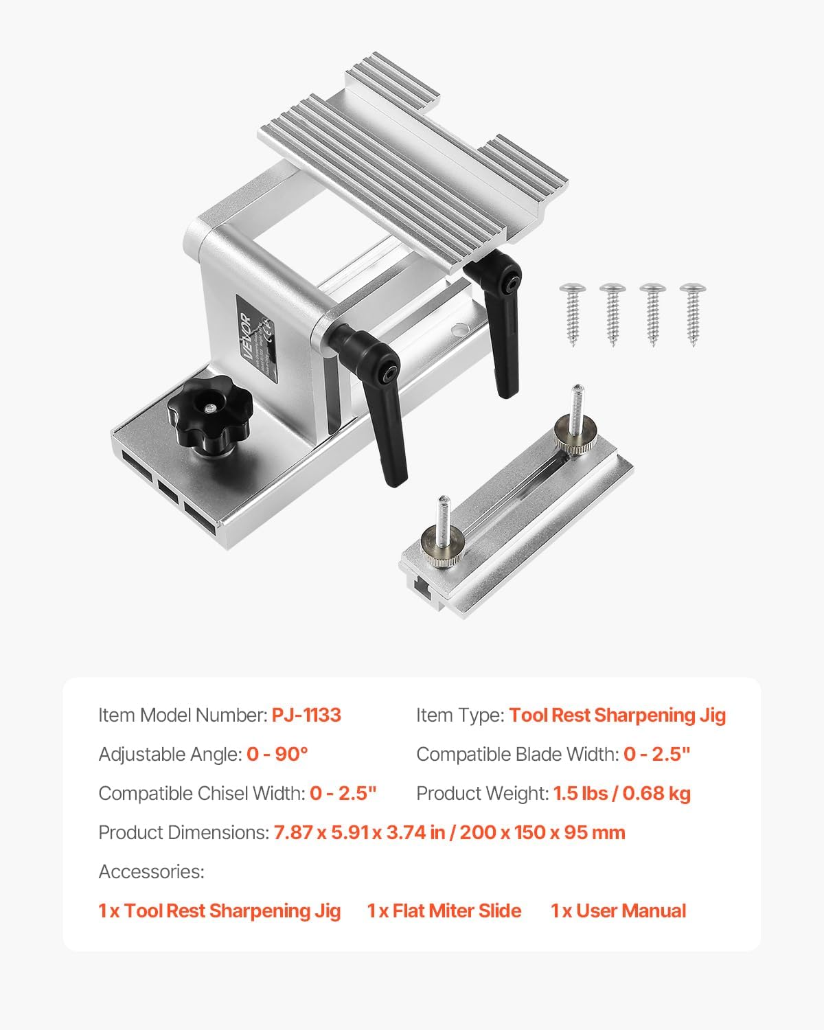 Wide Compatibility: VEVOR sharpening tool rest jig is compatible with most 6" and 8" manual or electric bench grinders, as well as sanders, and angle grinders. It accommodates blades and chisels up to 2.5 inches wide. (Bench Grinder Not Included)