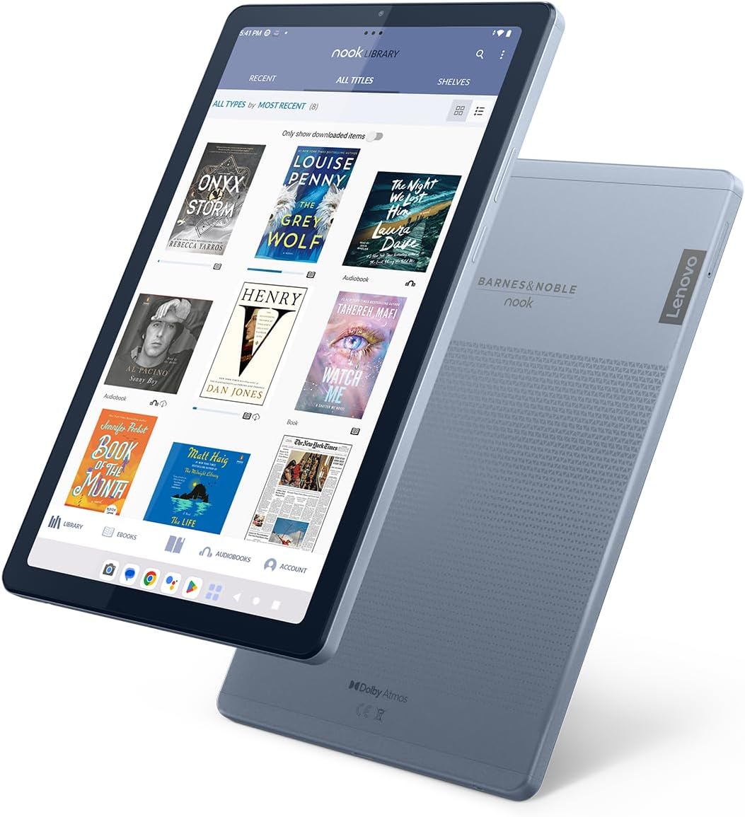 The Barnes and Noble Nook by Lenovo is a 9 inch HD Android Tablet. The Tab M9's full metal body cover is luxuriously smooth with a thin and light design. It's a stylish but durable tablet that everyone in the family will want to use. With more than 10,000 teacher-approved apps and games, plus hundreds of free book, Google Kids Space was created to help children discover, create, and grow. With their own individual account, secure your kids browsing and learning experience with parental controls. MediaTek Helio G80 processing with up to a 2.0GHz main frequency and blazing-fast WiFi give the Tab 9 the power and speed to keep your family entertained. It also boasts enhanced audio, thanks to dual speakers tuned by Dolby Atmos.