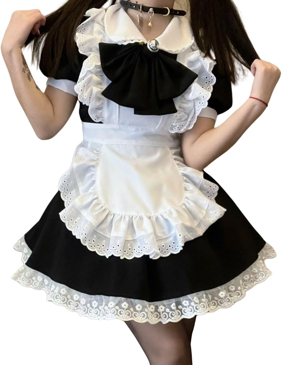 Women's French Maid outfit Anime Cosplay Costume Lolita Uniform Apron with Lace Trim Halloween Fancy Dress