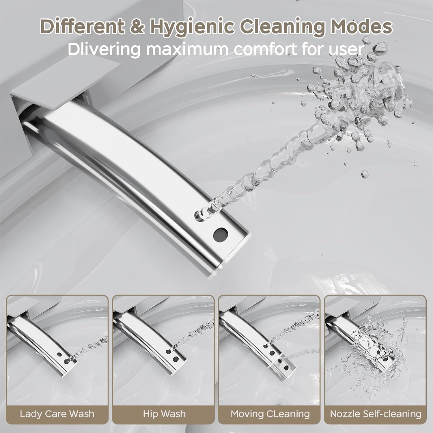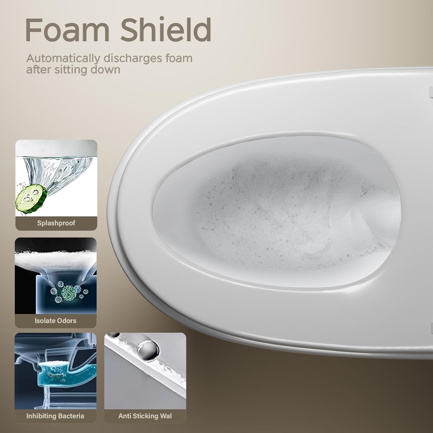 【Multi-Functional Cleaning Modes】This smart toilet bidet offers feminine care, posterior cleaning, and massage cleaning modes to meet diverse user needs. The self-cleaning nozzle and warm air drying system ensure maximum hygiene and comfort every time. The foam shield technology adds an extra layer of cleanliness, creating a spa-like experience in your bathroom.