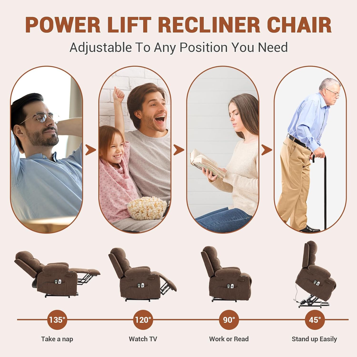 Effortless Positioning: The electric lift recliner chair offers versatile adjustments for ultimat comfort. Nap at 135°, watch a movie at 120°, read or work at 90°, or stand up easily at 45°. Designed for elderly, it ensures safe, stress-free rising