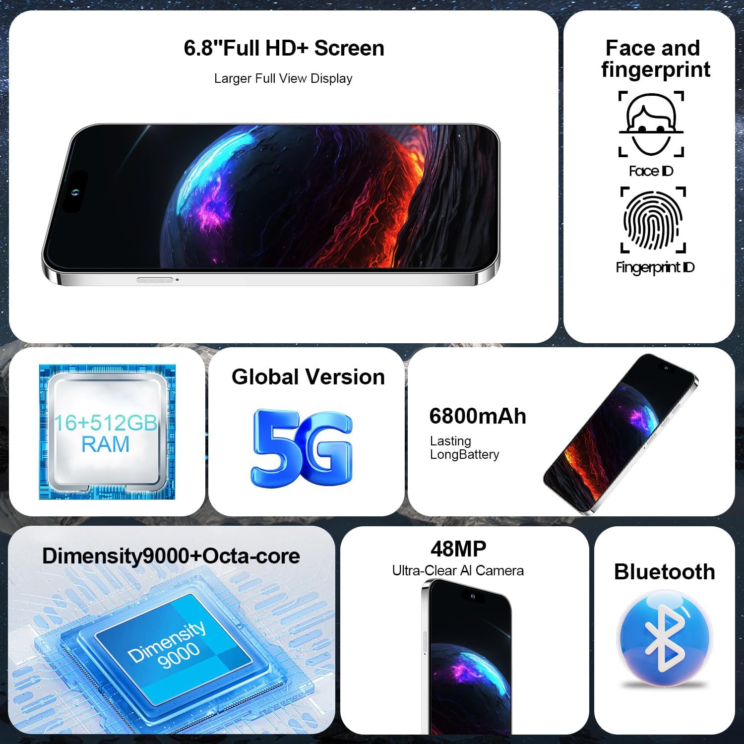 Unlocked Android Phone A15 PROMAX Android 14 Cell Phone with Dynamic Island 16GB+512GB 6800mAh,Fast Charging,HD Screen 48MP+108MP Camera Cell Phone with 5G Dual SIM Smart Phone (White)