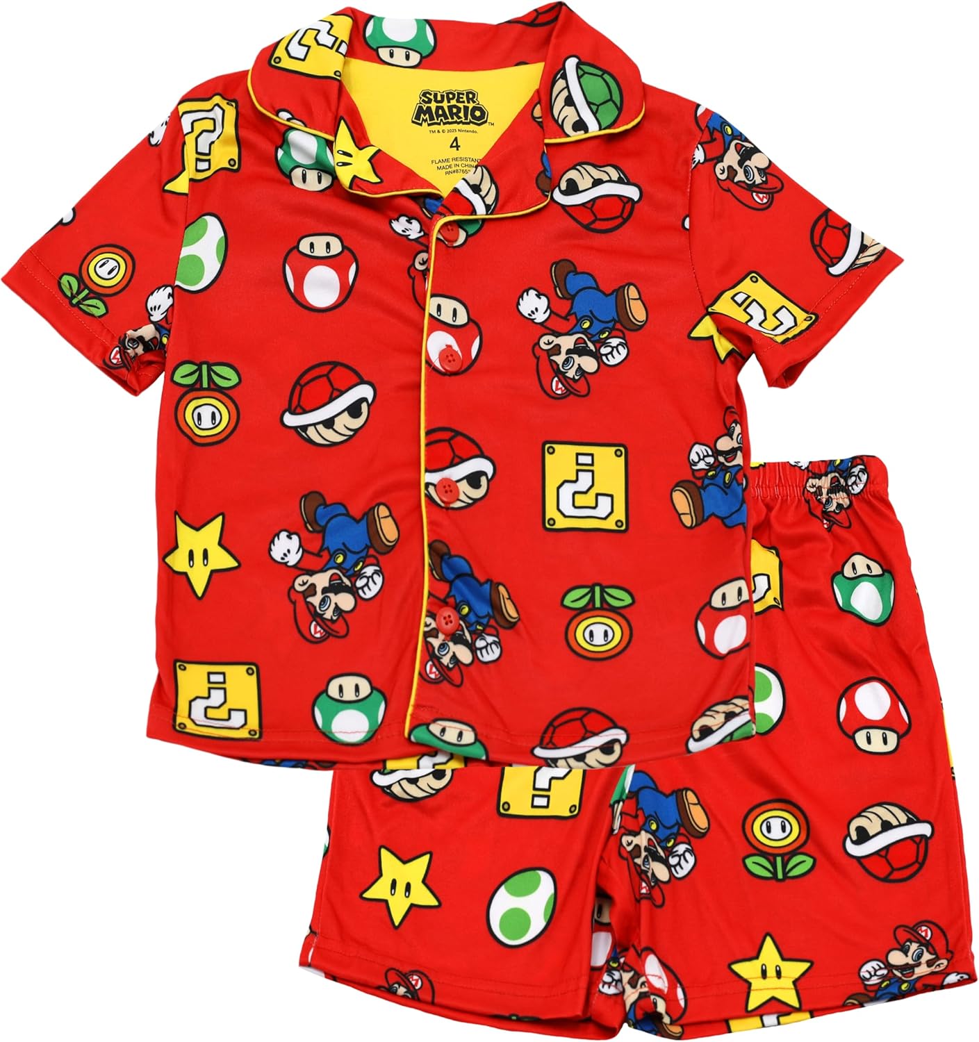 Get your little gamer ready for a night of adventure with this officially licensed Nintendo Super Mario 2-piece pajama set! This fun and comfortable sleepwear set includes a classic coat-style short-sleeve t-shirt and one coordinating pair of pajama shorts, making it easy to mix and match. Designed with vibrant, full-color graphics Super Mario, Red and Green Mushroom power-ups, Red and Green Koopah Shells and many more - these pajamas are sure to be a hit with any young fan of the iconic video game series. Crafted from a stretchy and breathable jersey knit polyester and spandex blend, this pajama set offers a relaxed fit that’s not only comfortable but also meets all required safety standards for children's sleepwear. The fabric is breathable and gentle on sensitive skin, making it ideal for year-round use. The elastic waistband on the shorts ensures a flexible, comfortable fit that stays in place through bedtime stories, game-themed dreams, and early morning adventures. Perfect for gifting or everyday wear, this high-quality set is available in toddler and kids sizes 2T, 3T, 4T, 4, 6, 8, and 10. Whether for lounging, sleeping, or weekend fun, this Super Mario pajama set brings color, comfort, and Nintendo magic to bedtime. Give your child the power-up they deserve with pajamas that are as fun as they are functional!