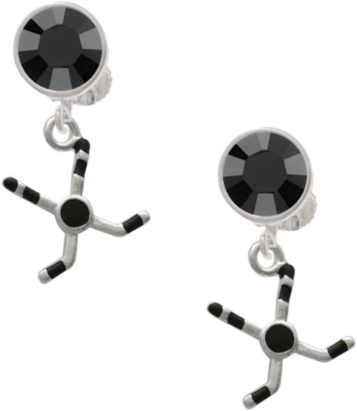 Silvertone Hockey Sticks with Puck - Large Crystal Clip on Earrings. Charm size is approx. 0.57 x 0.54 x 0.11 inches (HxWxD) including loop. Silvertone 8mm Crystal Earrings are 10 x 10 mm (HxW). These earrings are available in many crystal colors, which is perfect for sports teams, birthdays, school spirit, and your favorite color. The hinged earwires have an adjustable screwback to customize your fit. PLEASE NOTE: Our products are not intended for children 14 years and younger.