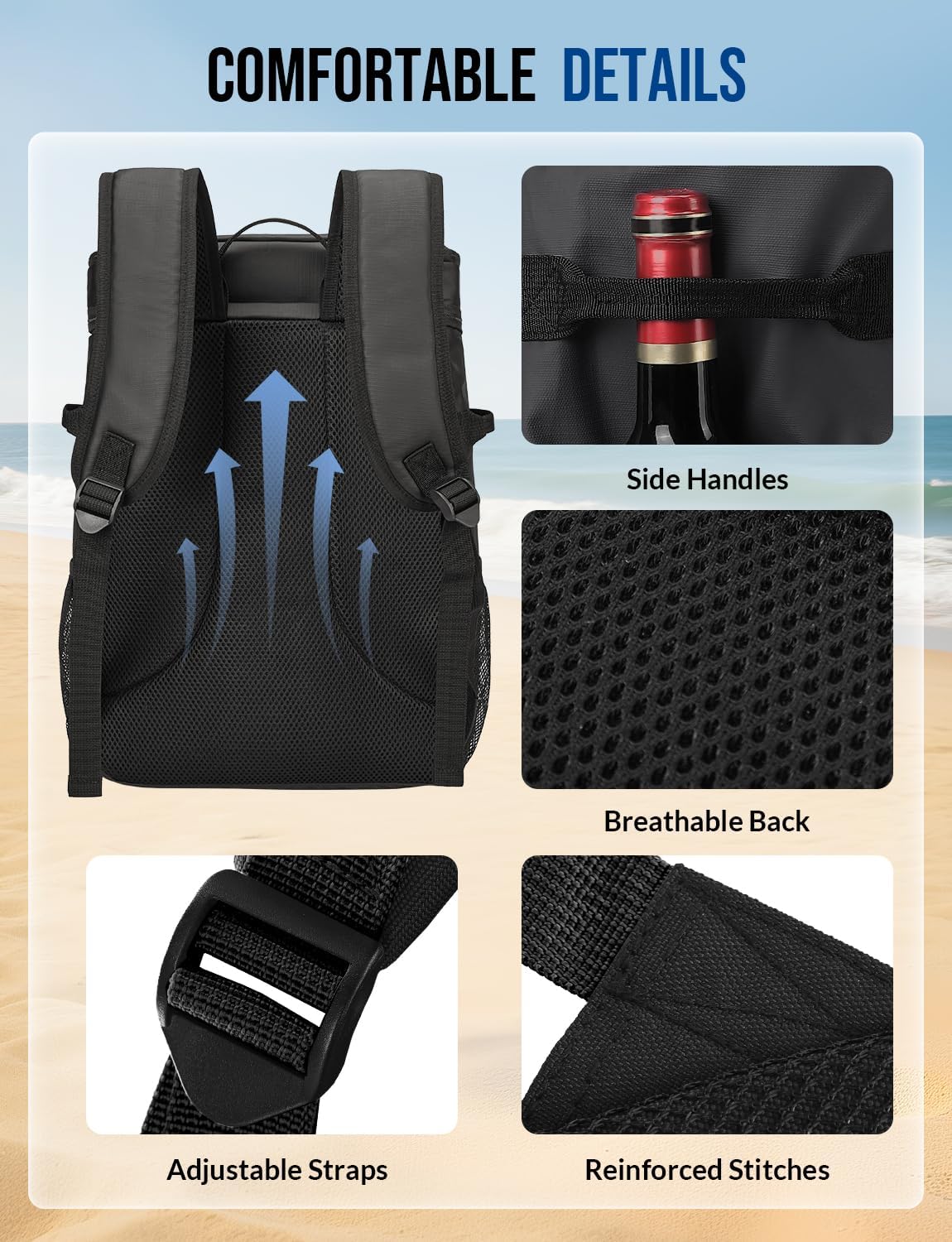 Leakproof & Insulated Backpack: Our cooler backpack adopts thickened 8 mm foam insulation, combined with premium thickened leak-proof and hot seamless pressing PEVA lining to make sure anti-leaking and keep food cold for 16-20 hours. Please note the zipper is not leak-proof and be careful not to tip over when using