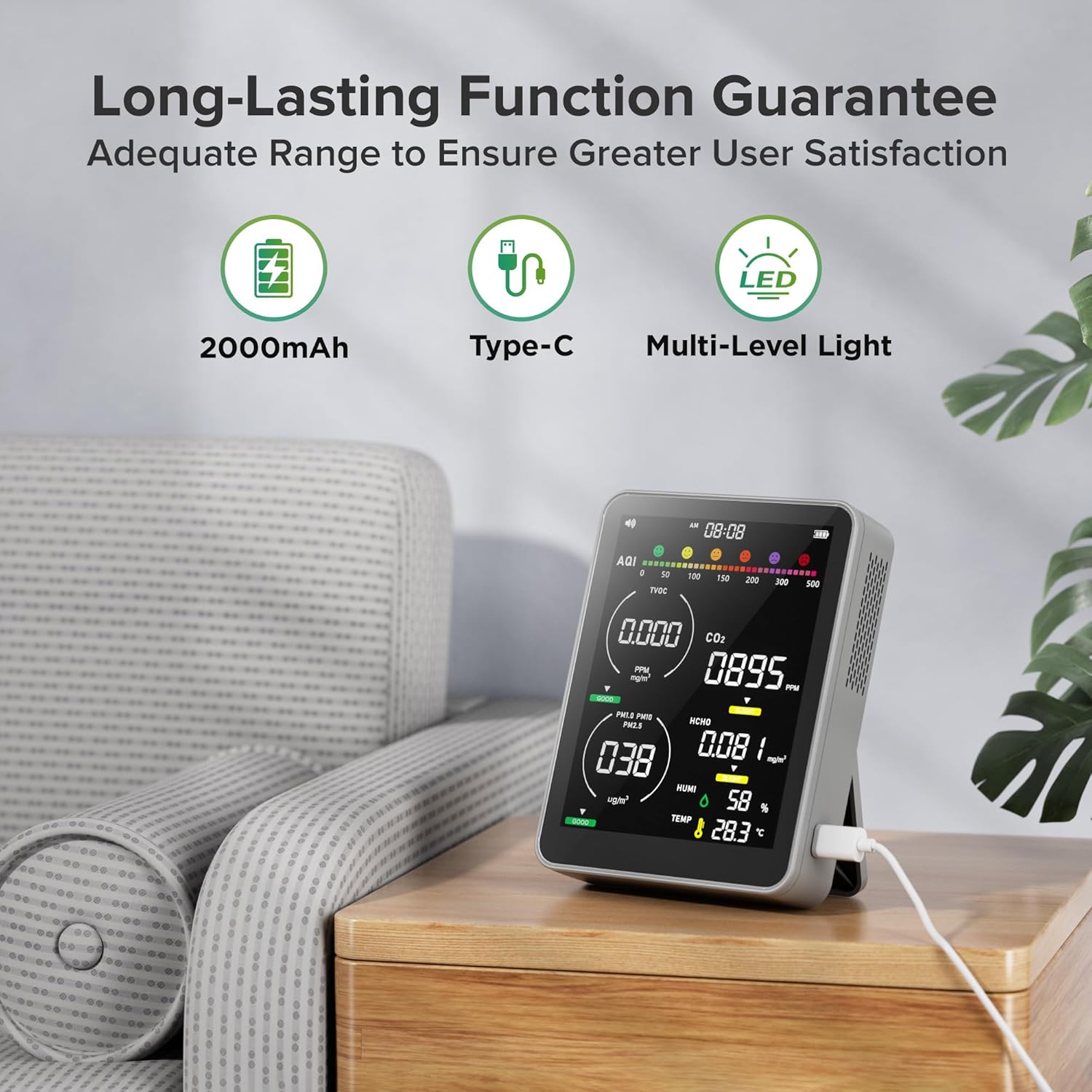[Long-lasting Battery & Continuous Protection]: The PinoTec Air Quality Detector has a built-in 2000mAh battery and comes with a standard USB charging cable. It can be used continuously for about 16 hours after being fully charged, meeting the needs of long-term monitoring. Note: Do not use it while charging or when the battery is low, as this may affect data accuracy. Equipped with a low-power processing chip, it can monitor air quality continuously for a long time, always caring for you and your family's health.