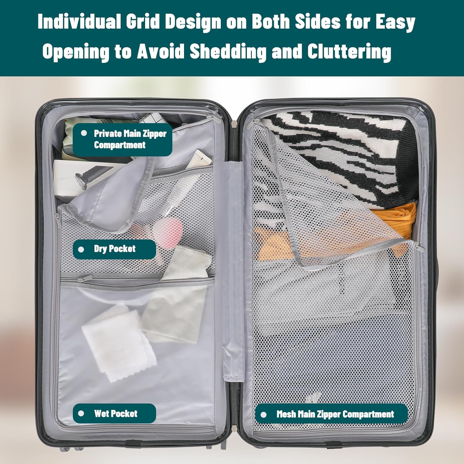 Individual Grid Design: The internal structure of both luggages features a zippered divider on both sides, a design that is easy to open and does not cause detachment and clutter when the suitcase is sliding around.