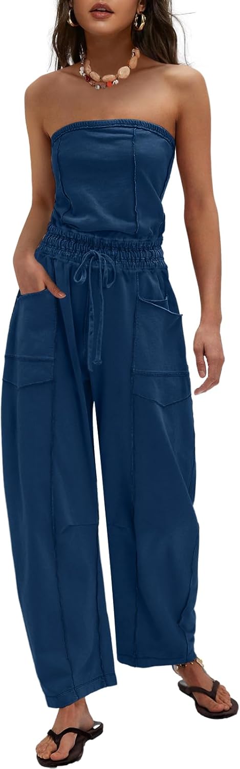 LAMISSCHE Womens Casual Strapless Jumpsuits off the Shoulder Summer Rompers Sleeveless One Piece Outfits with Pockets