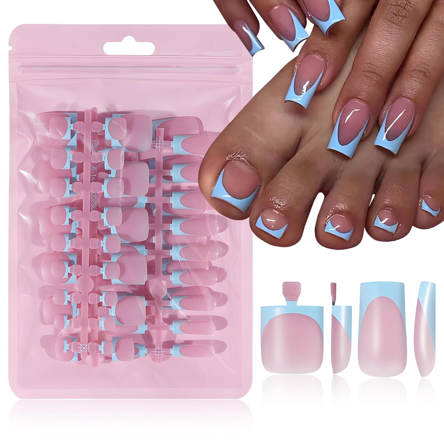 Sturdy and Quality Acrylic: Blue french tip acrylic nail tips square made from acrylic, toes press on nails square are designed for sturdiness and comfort. Square toe press ons french tip offer a long-lasting wear. Square nails for toes are also easy to maintain and clean. Square stick on nails for women seamless and natural. Square toenail tips for acrylic resist chipping and maintain vibrant colors, french false toenails square offer a professional lasting look.