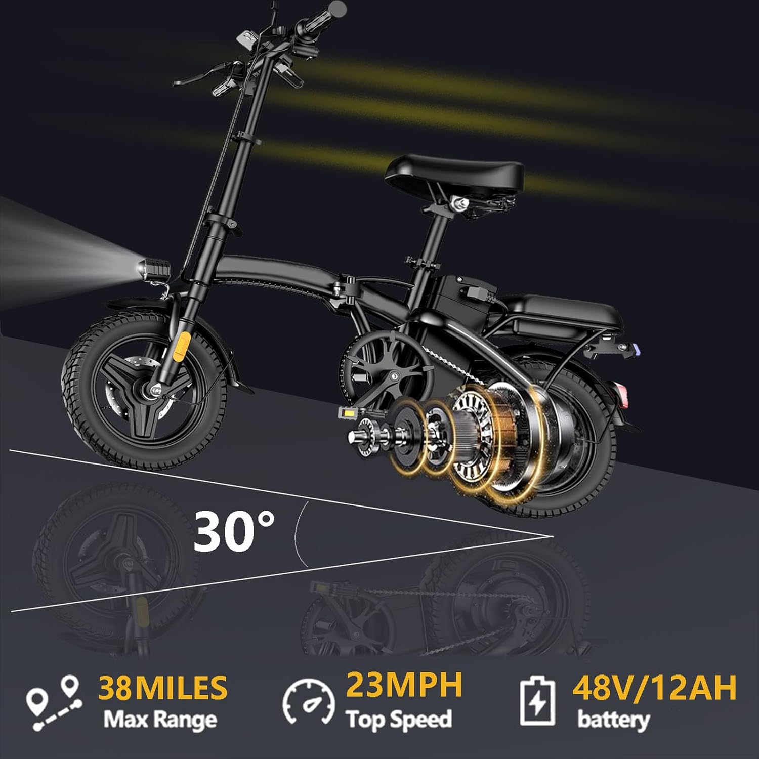 Folding Electric Bike for Adults, 500W Motor, 23MPH, 14" Mini Ebike | Pedal Assist | 30° Uphill | Shock Absorbers | 48V12AH Removable Battery | UL 2849 | Dual Disc Brake | 38 Miles PAS Range