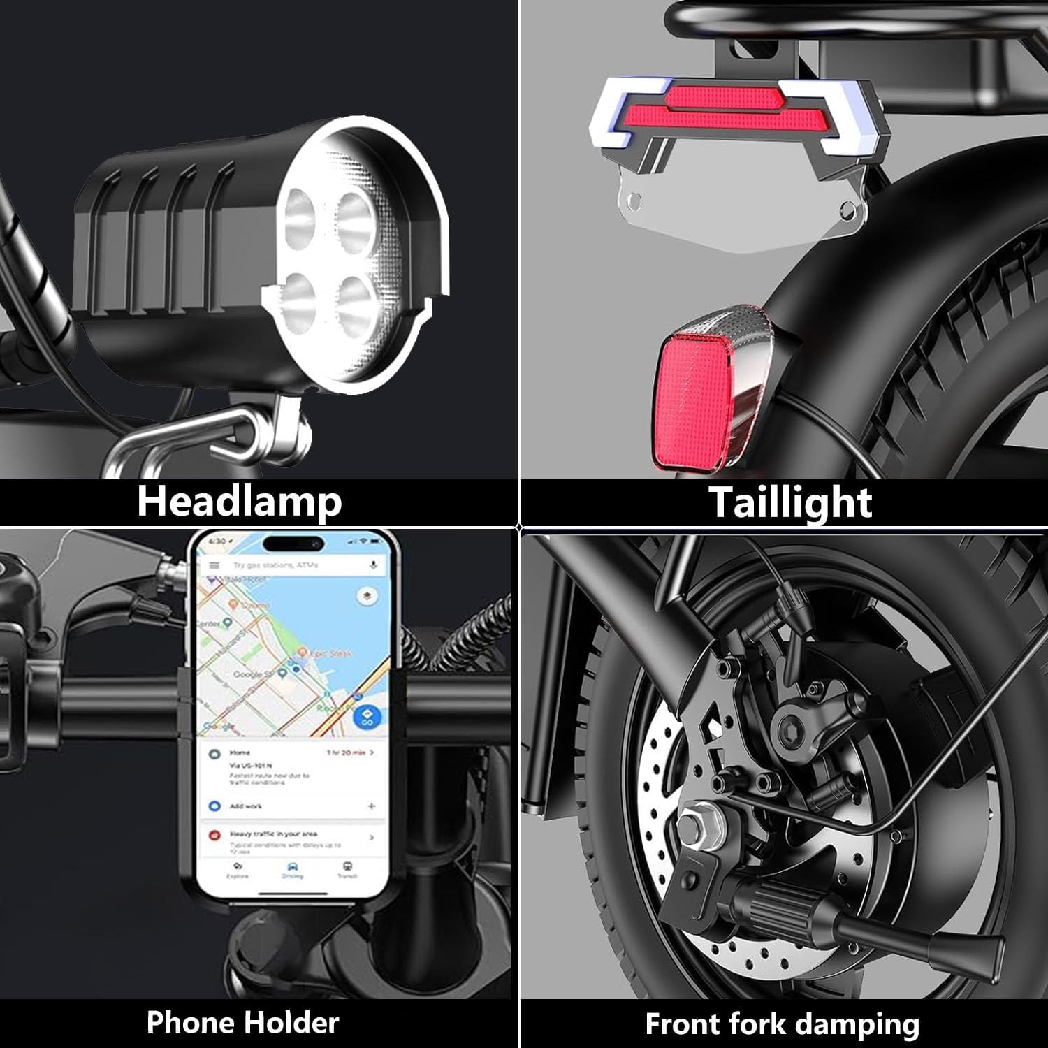 【All-Terrain Safety System】 Ebike with a LCD display, Bright LED headlight and rear light, e-bike equipped with front and rear dual disc brakes, and anti-theft alarm, you can ride with confidence knowing you're fully protected for safer journeys. Thoughtful e bike accessories like headlight and horn, rear cushion with passenger, ebike with basket, ebike with front pedals.