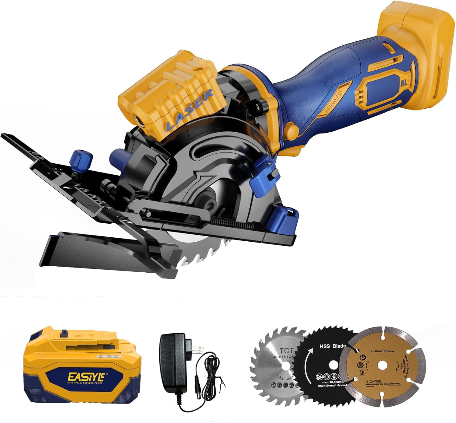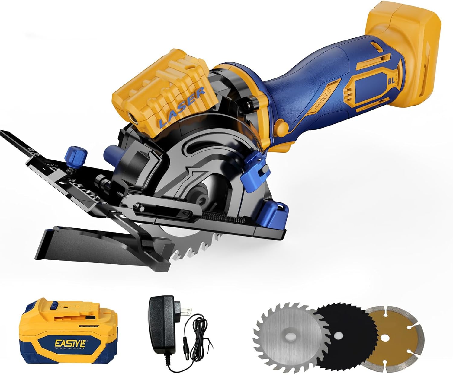 【Powerful Brushless Motor & 3 Versatile Blades】 Experience high-efficiency cutting with our brushless motor reaching 3200 RPM. Tackle diverse projects with the included 3 blades (3-1/2"/89mm): A 24T TCT blade for fast wood cutting, a 44T HSS blade for clean cuts in plastic and soft metal, and a diamond blade for tough tile, drywall, and cement board. Easily swap blades for any material,an ideal cutting off tool for you