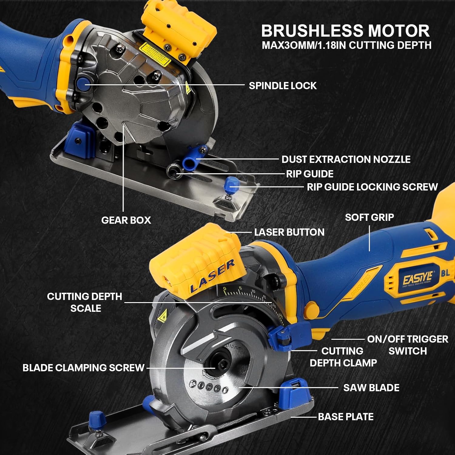 【Precise Laser Guide & Adjustable Cutting Depth】 Achieve straight, accurate cuts every time thanks to the bright laser guide and clear scale ruler. Quickly set the cutting depth from 0 to 30mm using the easy-to-read depth scale and lever, ideal for plunge cuts and controlled material removal