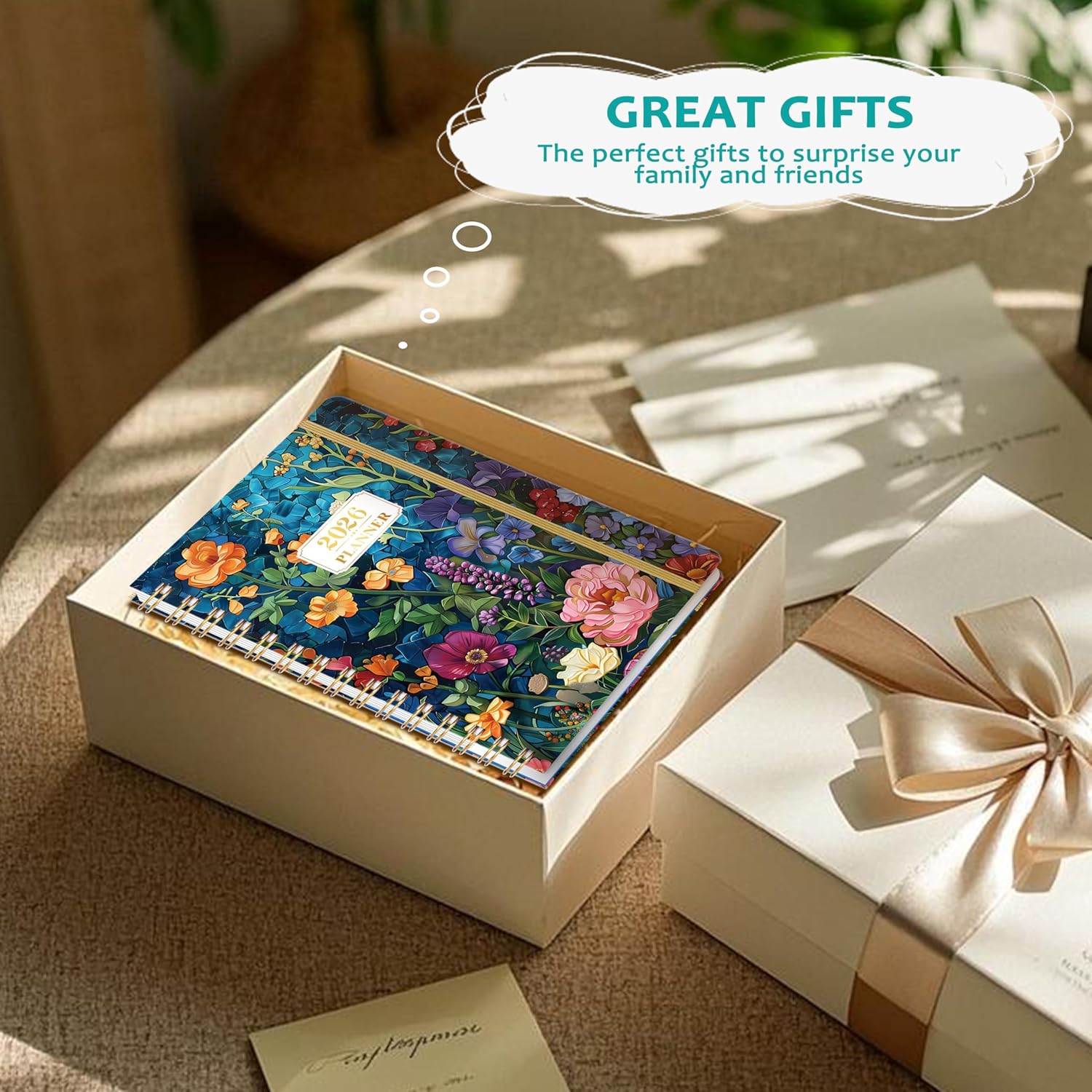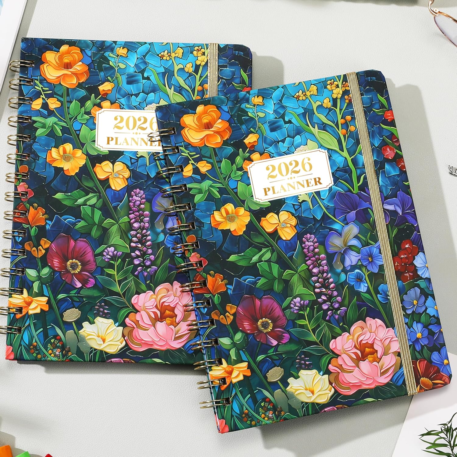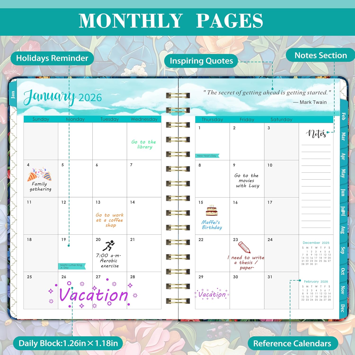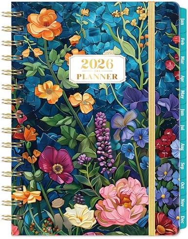 💐SPECIALTIES: Monthly calendar planner pages + Weekly pages + 2026-2027 Year overview + Notes + Reference calendars + Inner pocket + Thicker paper + Monthly tabs + Twin-wire binding+ Daily block + Marked holidays + 2 contact pages + Rounded crner design + Elastic straps. This planner 2026 features an exquisitely designed cover and is crafted to meet all your planning needs.