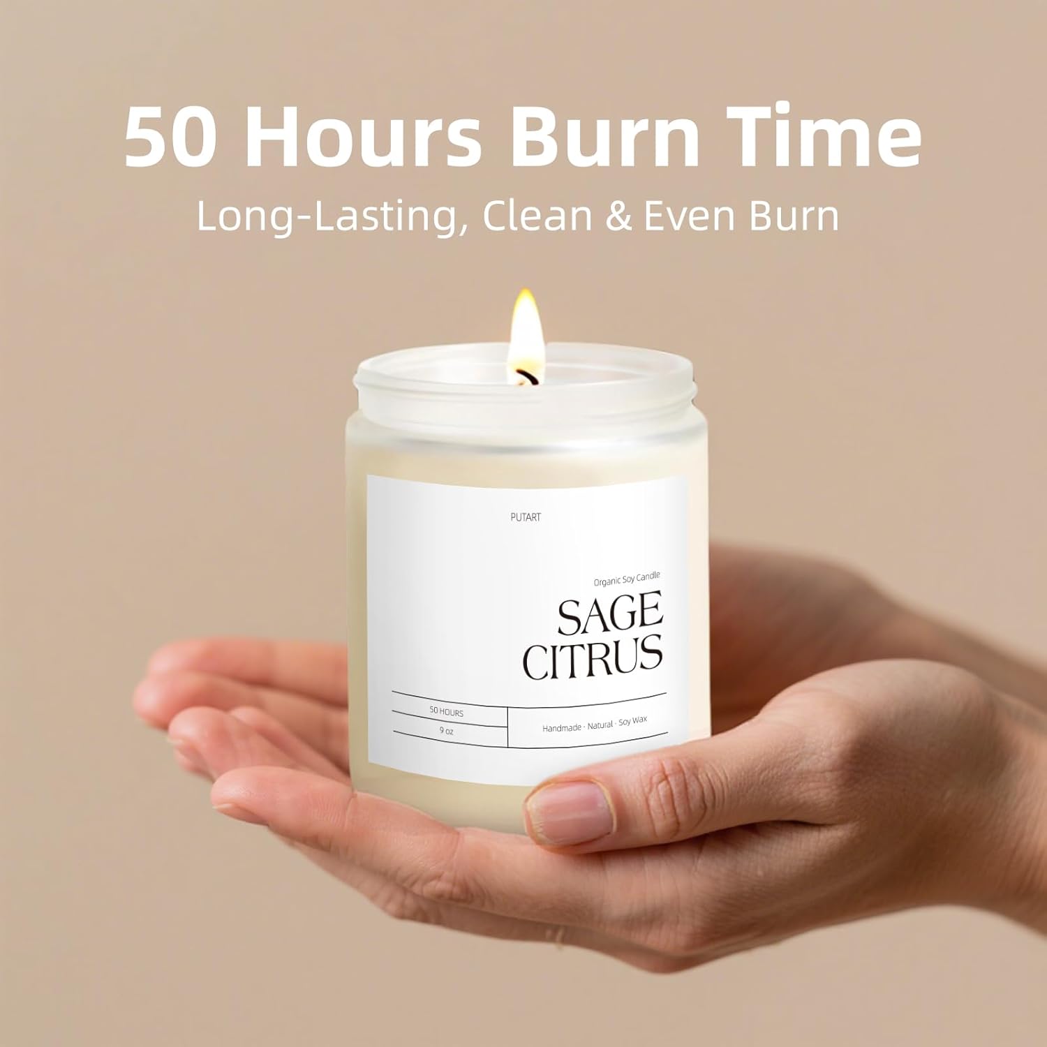 【Long Lasting, Clean & Even Burn】Putart's sage citrus soy candles feature lead-free cotton wicks for a stable, even burn that lasts up to 50 hours without emitting black smoke. This long burning jar candle provides a delightful, enduring fragrance, perfect for living room, offices, bedrooms, or bathrooms. Whether for work, bedtime rituals, yoga, meditation, spa sessions, or baths, our candle creates an ideal atmosphere and delivers an immersive aromatic experience.