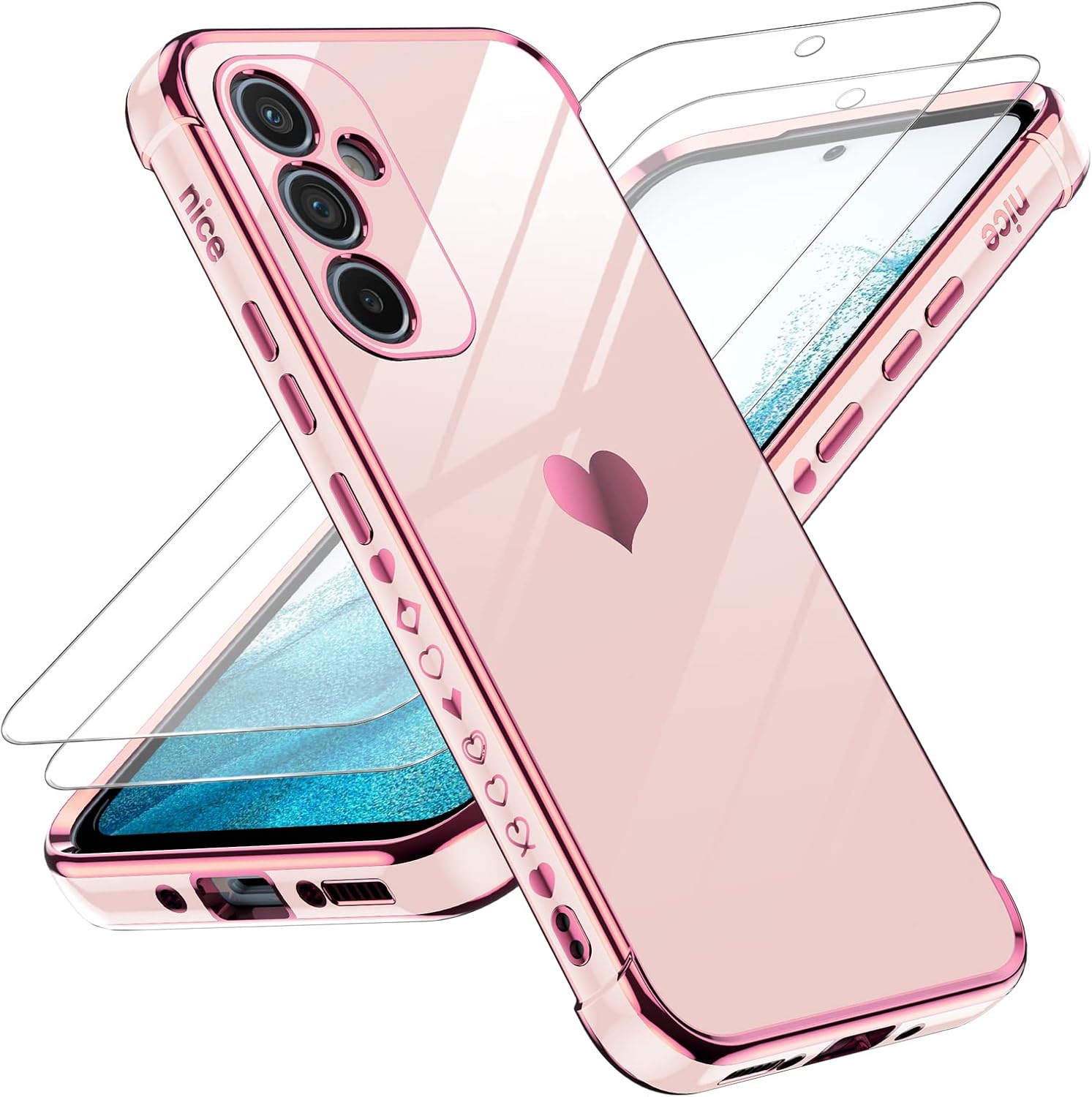 LeYi Compatible for Galaxy A54-5G Phone Case: with 2Pcs Tempered Glass Screen Protector+ Full Camera Lens Protection,[Love Heart Pattern] Plating Gold Edge Women for Samsung Cover A 54, Pink