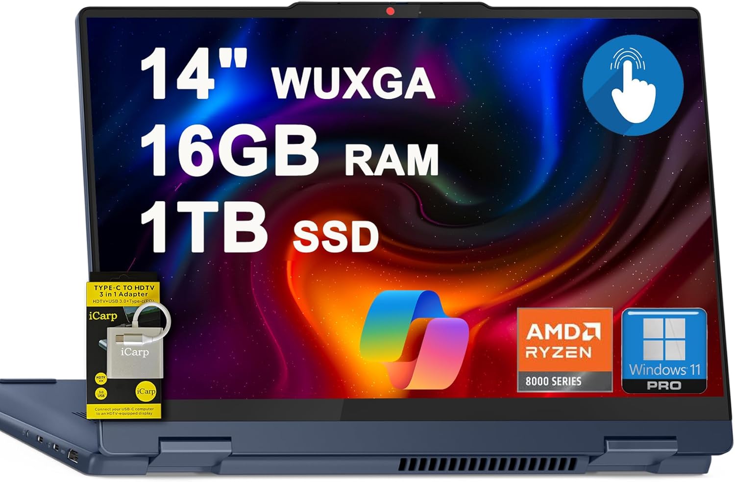 Lenovo IdeaPad Flex 5i 2-in-1 Laptop 14" WUXGA Touch AMD 8-core AI-Powered Ryzen 7 8840HS Up to 16 Tops 16GB RAM 1TB SSD for Creator Designer Business Professional Win11Pro ICP Hub Copilot AI PC