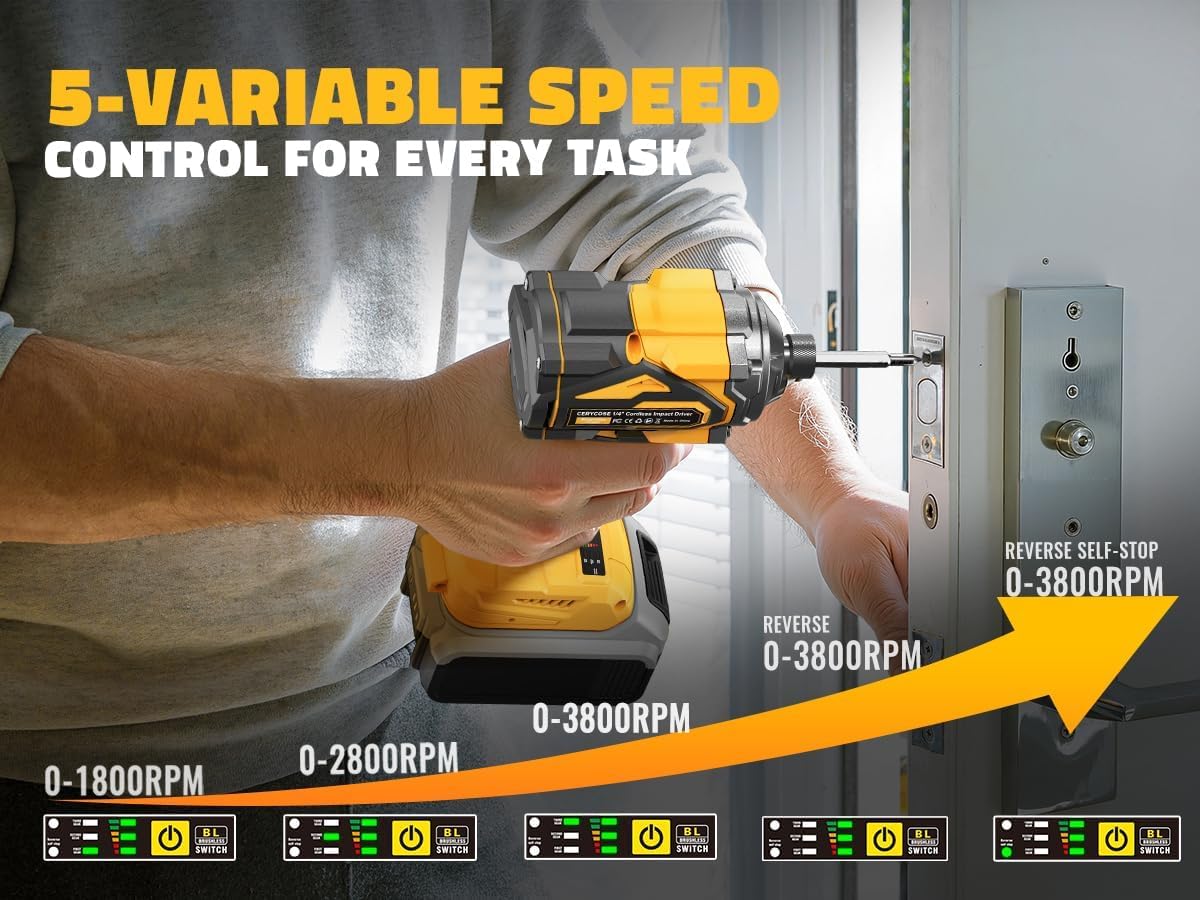 2800 IN-LBS BRUSHLESS MOTOR | 3800RPM + 4200IPM POWERHOUSE ✓ Impact driver with High-efficiency brushless motor delivers max torque for stubborn bolts & screws ✓ Professional-grade 3800RPM speed tackles heavy-duty jobs 30% faster ✓ Brushless impact drill with 4200 impacts/minute bursts through tough materials effortlessly