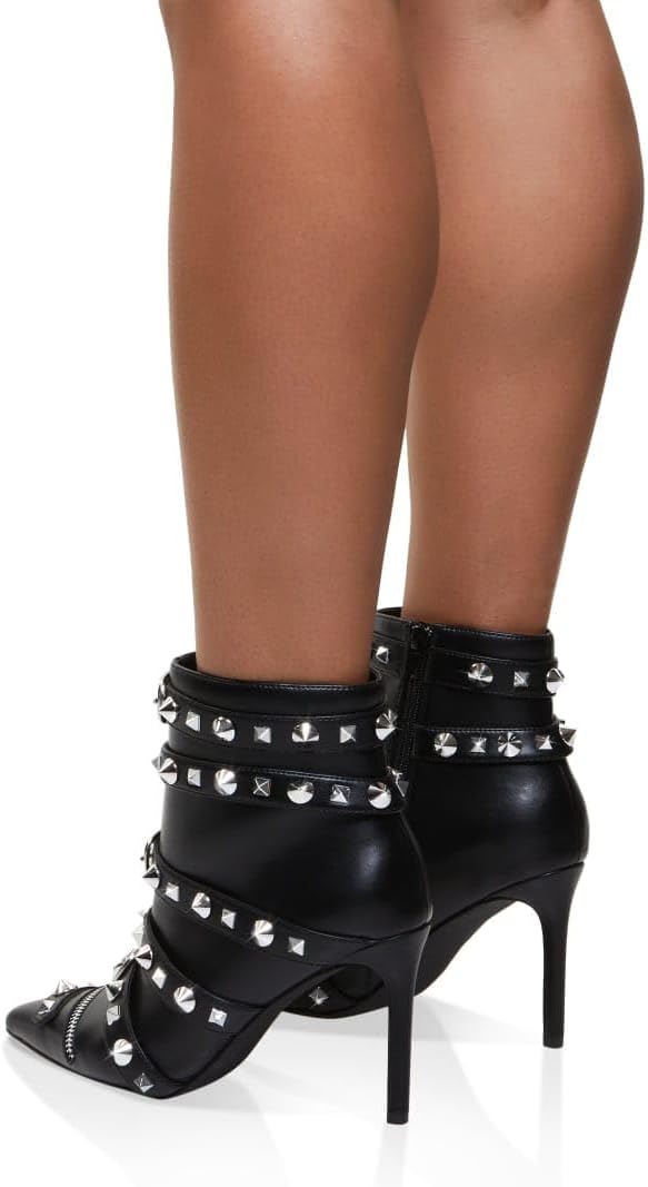 Make a bold fashion statement with these eye-catching ankle booties. Featuring an edgy design with multiple buckle straps adorned with striking metallic studs, these stiletto heel boots combine style with attitude. The pointed toe silhouette and sleek zipper detail add contemporary flair, while the high heel creates an elongating effect. These booties are crafted from glossy material that catches the light beautifully. The multiple adjustable straps with decorative buckles not only serve as striking design elements but also ensure a secure fit. Perfect for those who dare to stand out, these statement boots can elevate any outfit from casual to dramatic. The combination of studs in both pyramid and round shapes adds dimensional interest, while the metallic hardware in mixed tones creates a luxe appeal. These attention-grabbing boots are ideal for fashion-forward individuals who appreciate bold, distinctive footwear.
