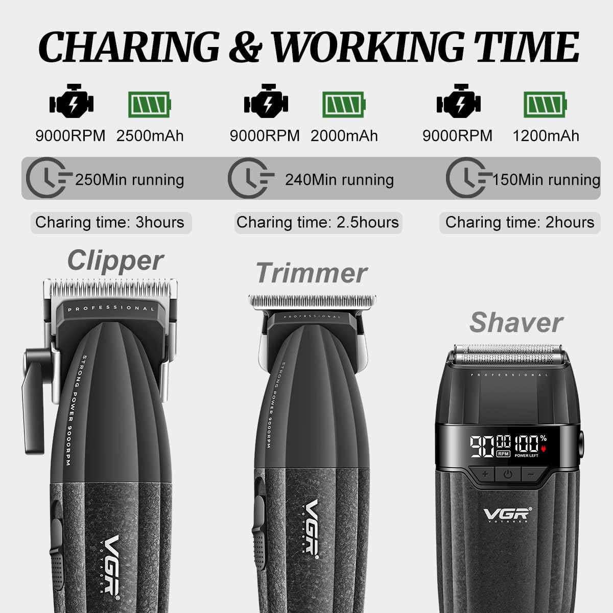 EXTENDED BATTERY LIFE & LED DISPLAY:The hair clipper features a 2500mAh battery offering up to 250 minutes of runtime, the trimmer has a 2000mAh battery for 240 minutes, and the electric shaver includes a 1200mAh battery lasting 150 minutes. Each tool has an LED display showing real-time battery status, so you’re never caught off guard. Whether for full grooming sessions or daily touch-ups, the long-lasting battery power ensures you stay ready, anytime