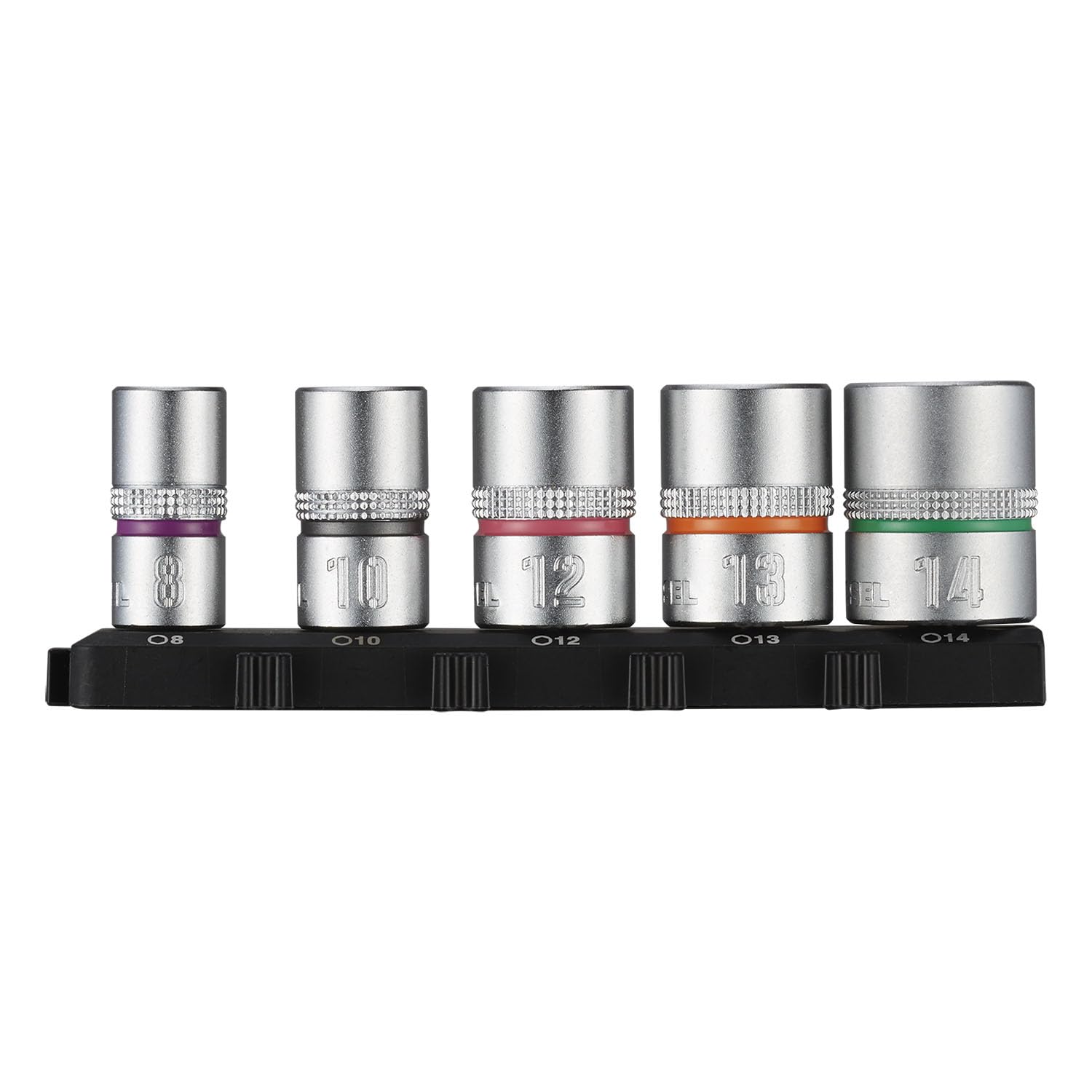 Includes 5 sockets (8, 10, 12, 13, 14mm) and 5 bits (+1, +2, +3, SL4, SL6)