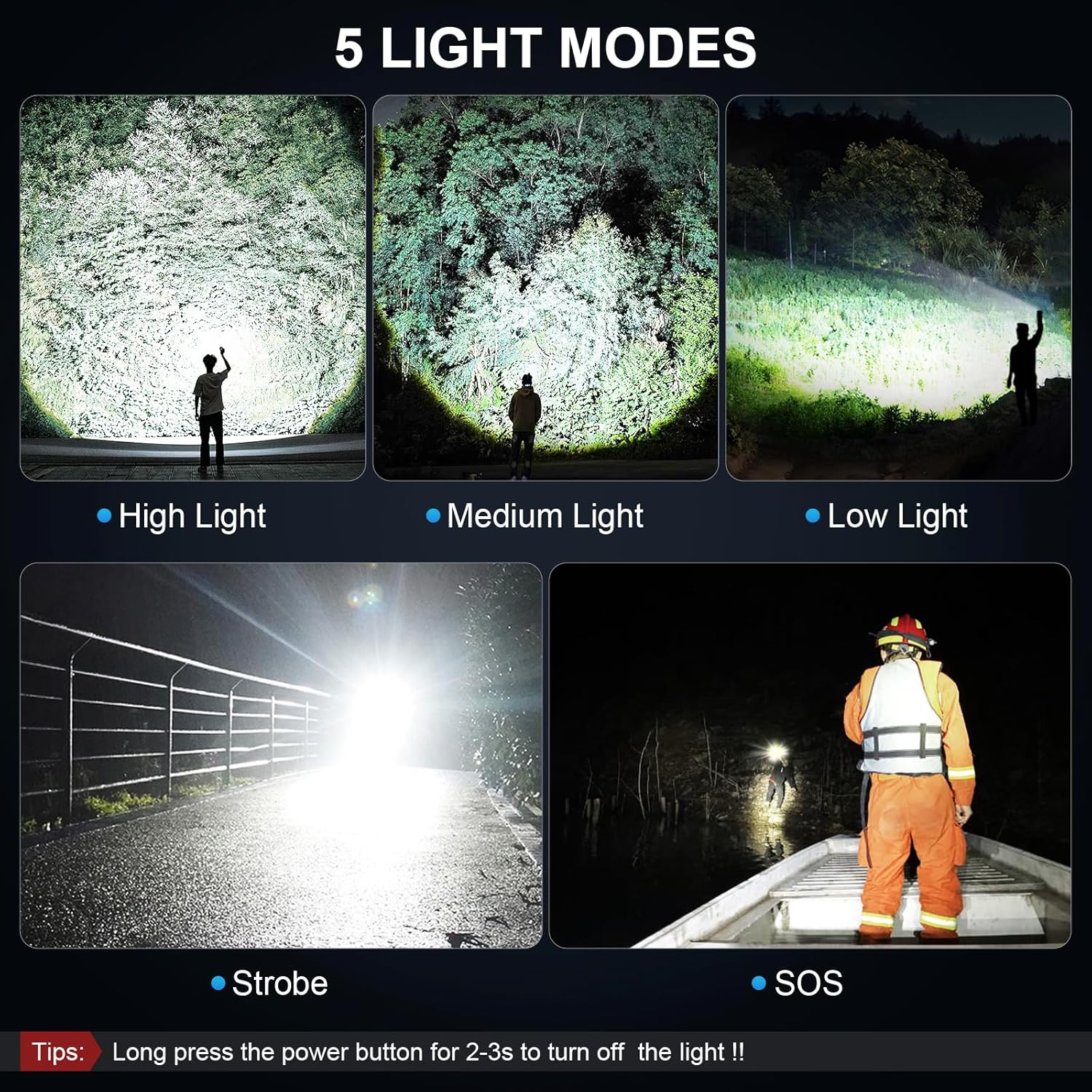 【5 Lighting Modes & Adjustable Beams】Powerful flashlight has 5 working modes: High, Medium, Low, Strobe, SOS. Short press the power button to switch modes, long press for 2-3 seconds to turn off the led flashlight. Adjust the beam distance and light range by extending the top of the super bright flashlight. Brightest flashlight rechargeable can light up to 2200 square feet area under wide beam or 3280ft distance under narrow beam