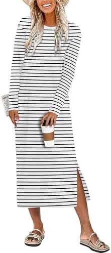 ANRABESS Long Sleeve Midi Dresses for Women Fall Fashion Casual Vacation Crewneck Loose Split Striped Long Tshirts Dress