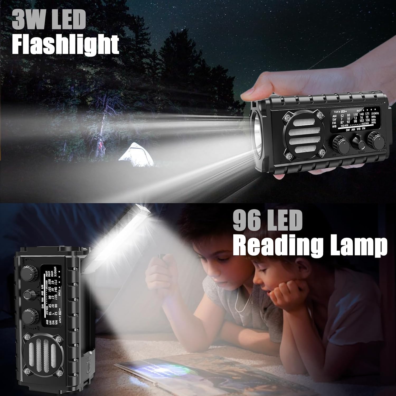 [Multi-function emergency radio ] 96LED Warm Light + 120dB SOS Alarm--Dual lighting: 3W spotlight for search/rescue + 96LED low-blue reading lamp. Exclusive 120dB SOS siren (louder than jet engines) with reflective rescue strap. Audible/visual distress signaling for wilderness emergencies.
