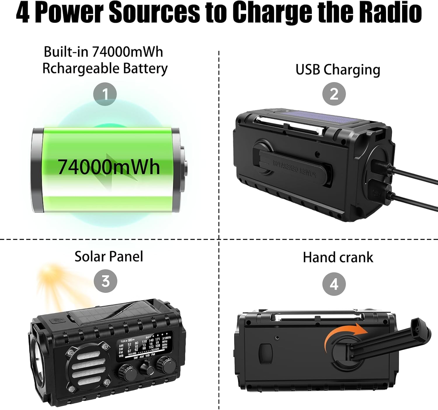 [20000mAh Emergency Power Bank ] 72-Hour Survival Charging Station--Industry-leading 20000mAh polymer battery charges an iPhone 14 Pro 5 times or powers the radio for 48+ hours. Triple charging options: solar panel, hand crank, and Type-C fast charging. 5 minutes of cranking = 30 minutes of emergency calls. 4-level power indicator + digital display ensures energy control during blackouts.