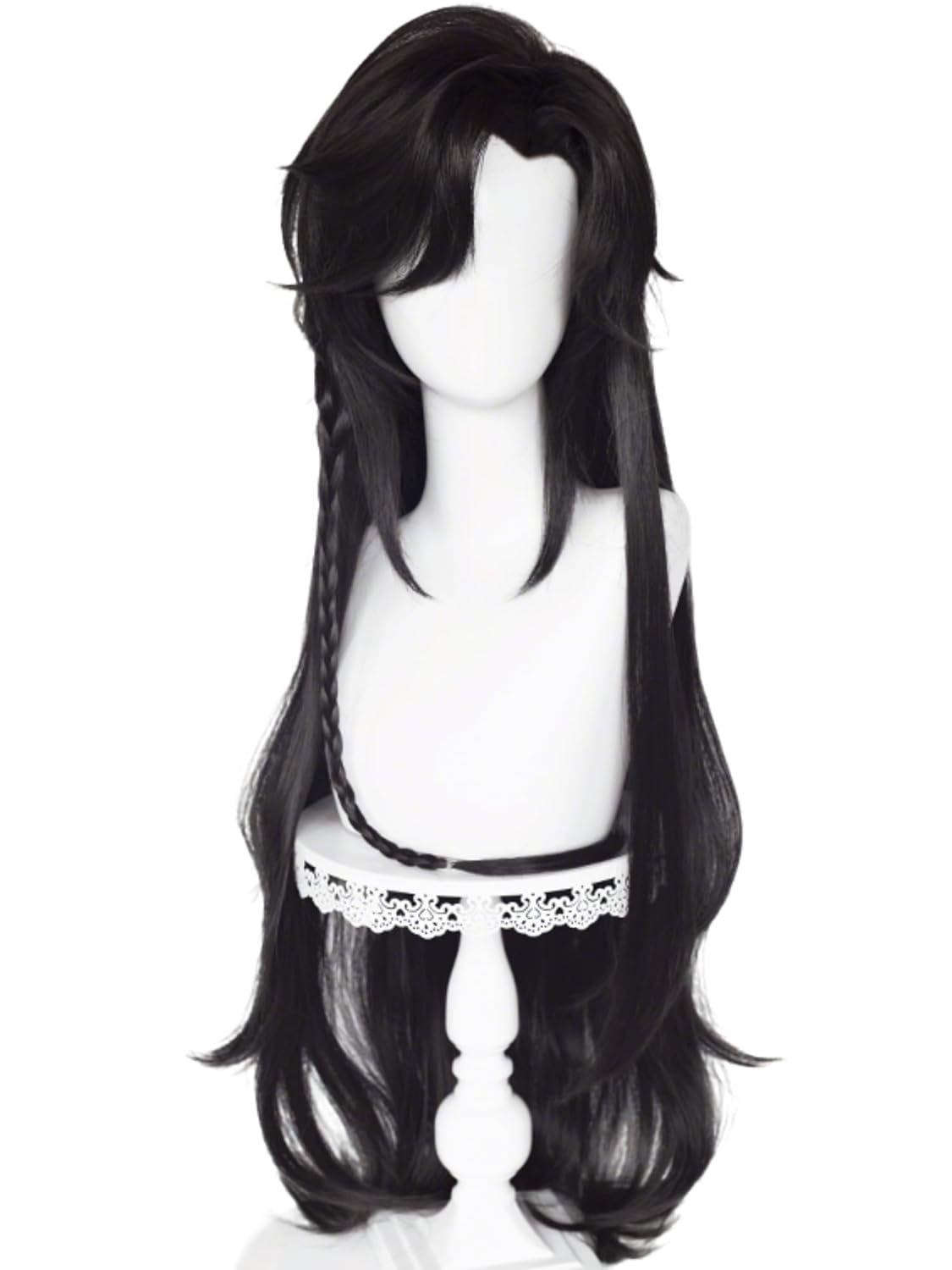 Hua Cheng Cosplay Wig Long Black Curly Anime Wig with Bangs & Braid 31.5'' Black Side Part Wigs for Men Women Halloween Party Daily
